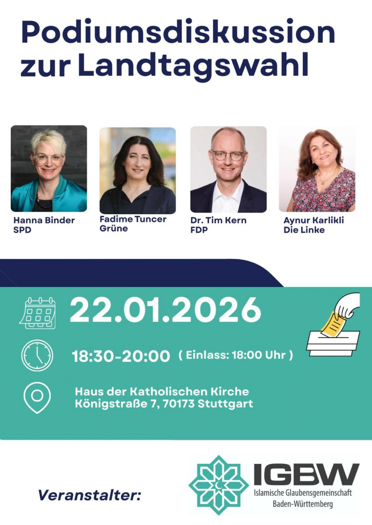 Die kommende Landtagswahl ist ein entscheidender Moment für die Zukunft von Baden-Württemberg. Um den politischen Diskurs zu fördern und Ihnen eine Entscheidungshilfe zu bieten, laden wir Sie herzlich zu unserer Podiumsdiskussion ein.